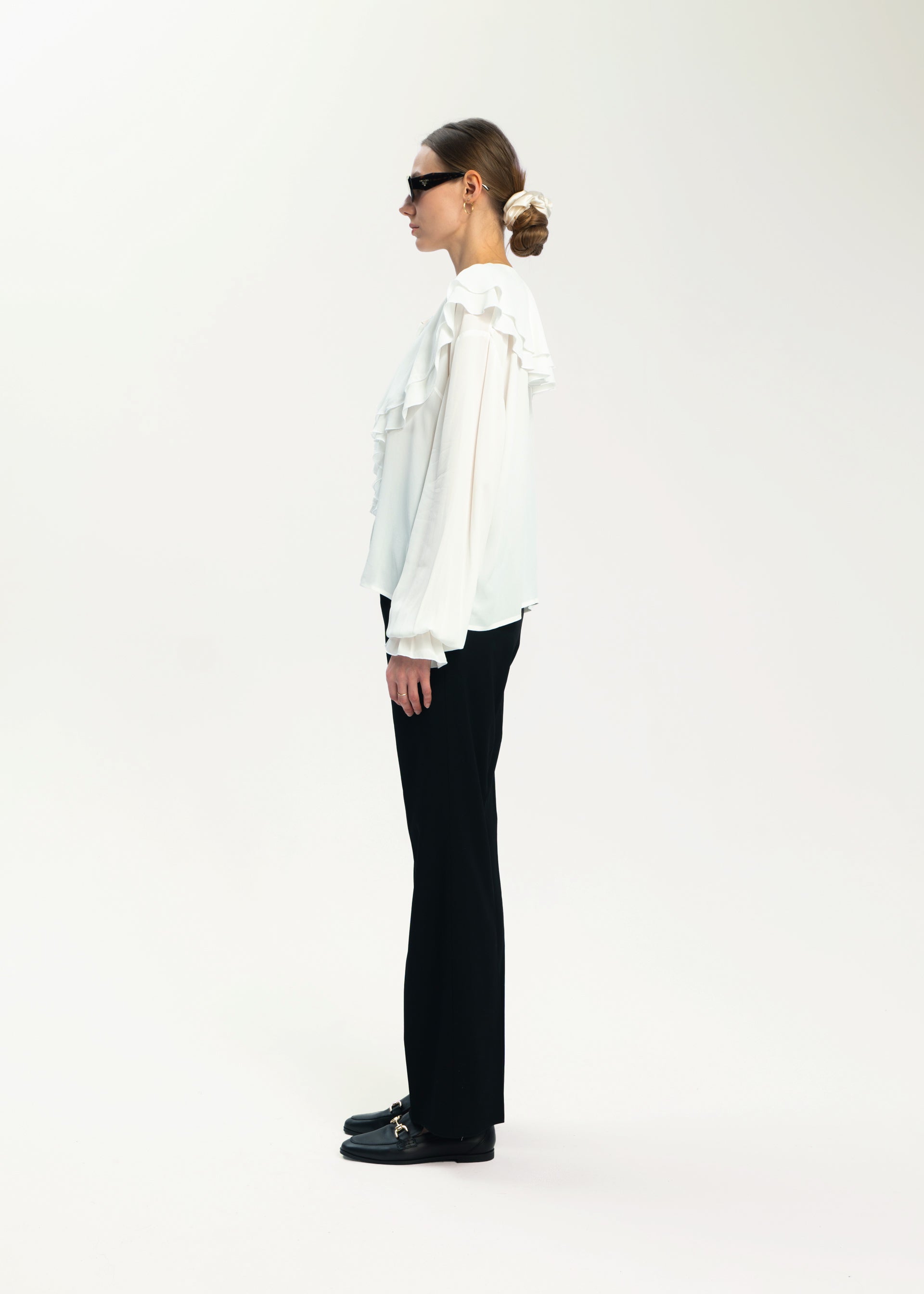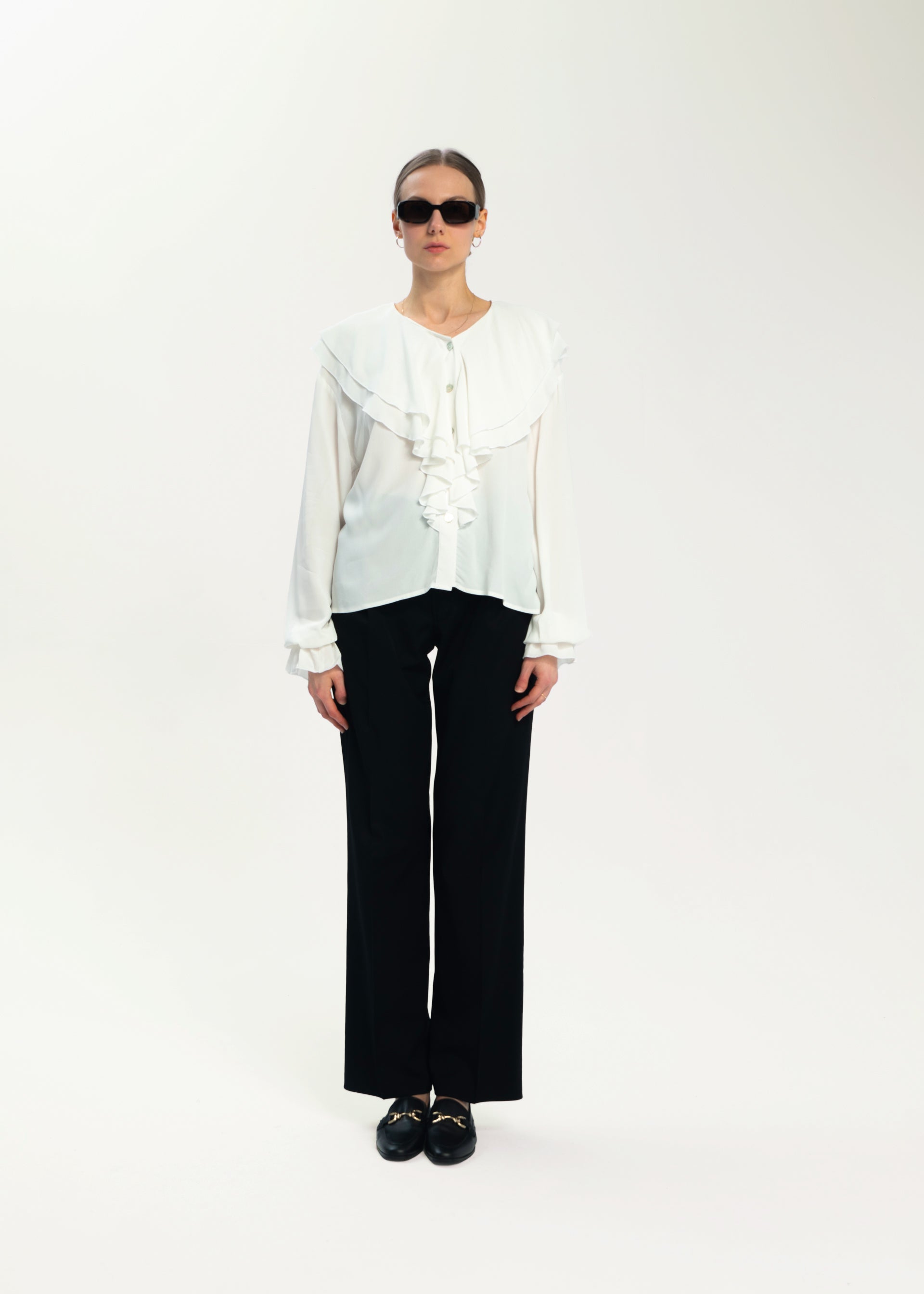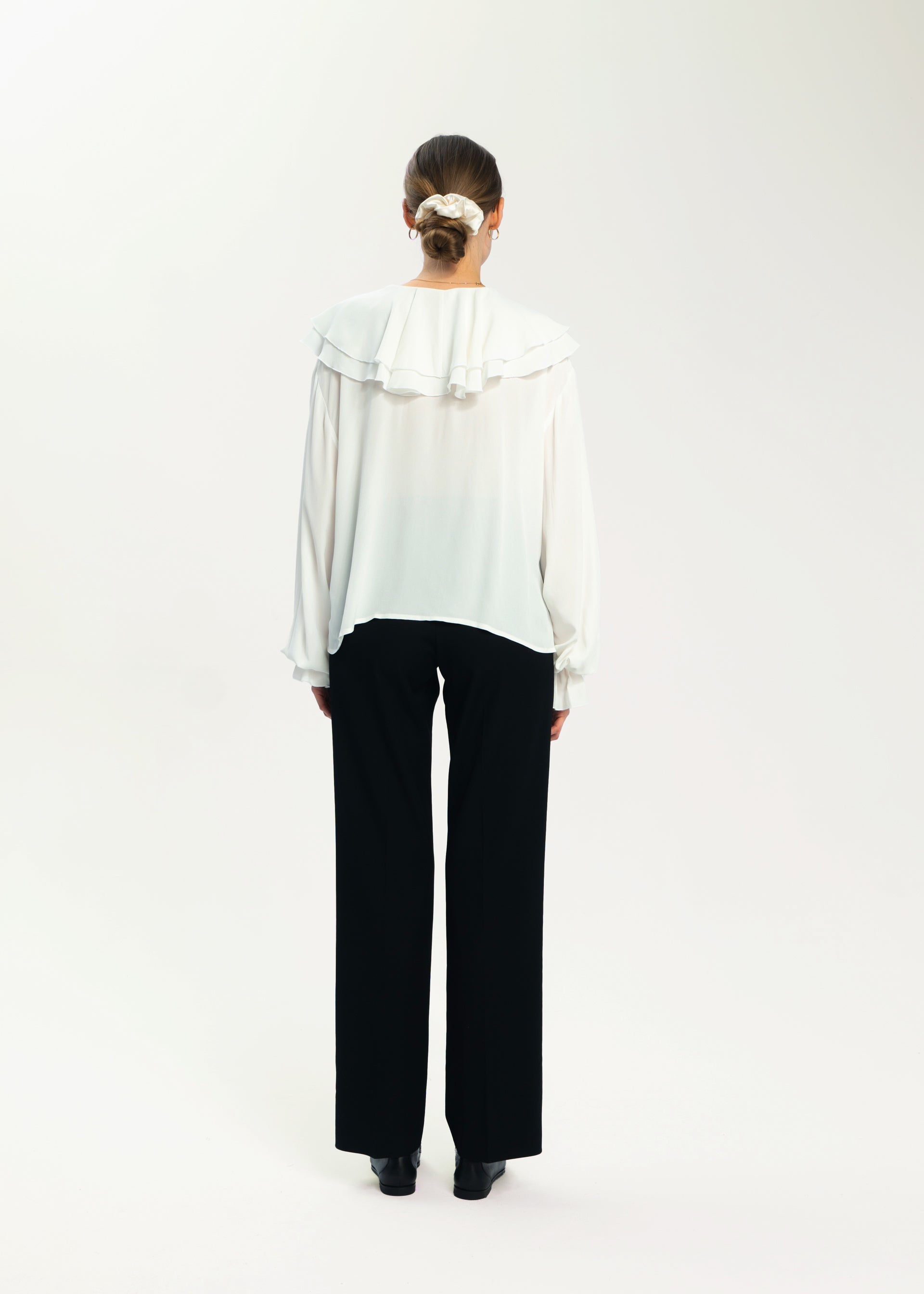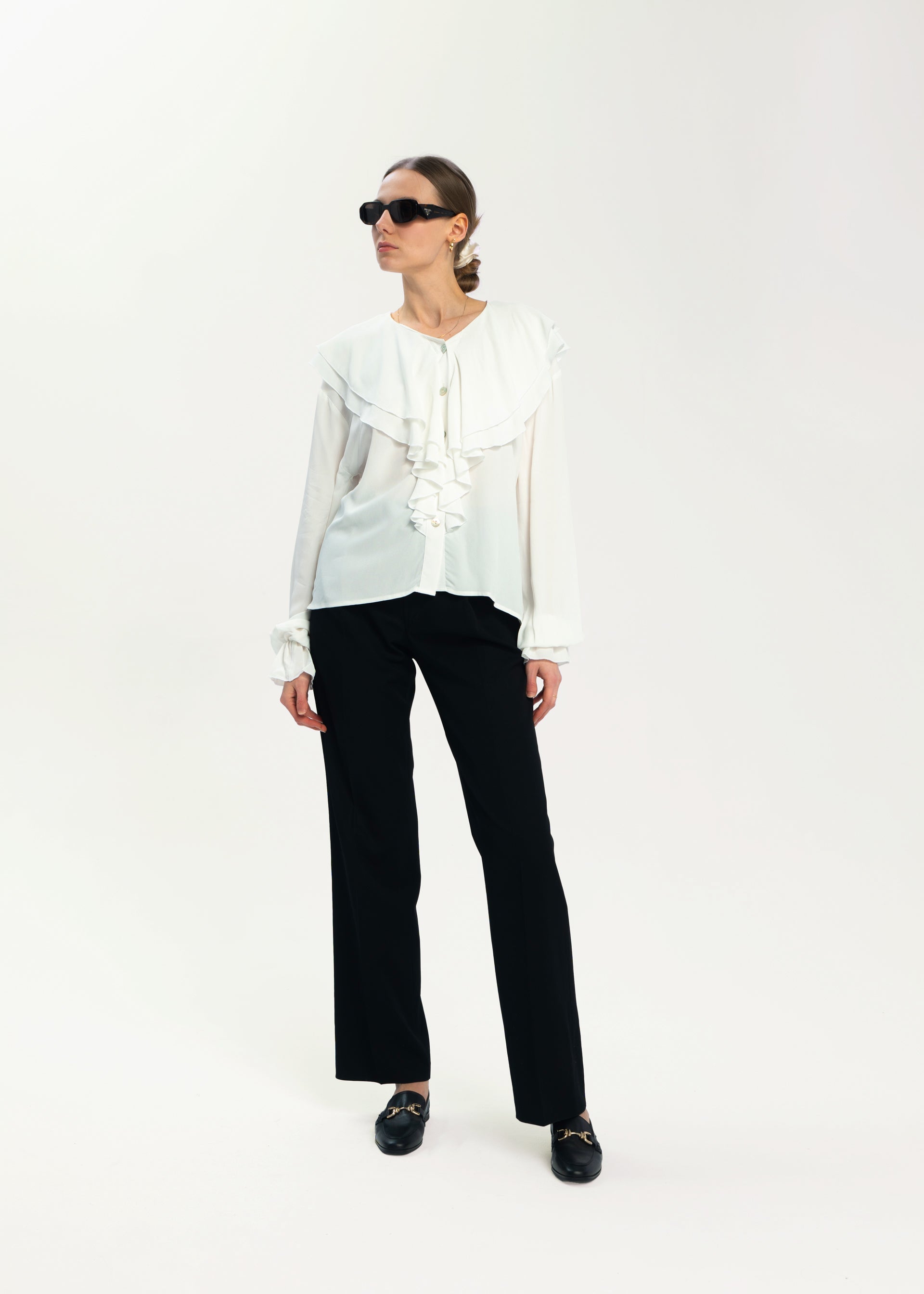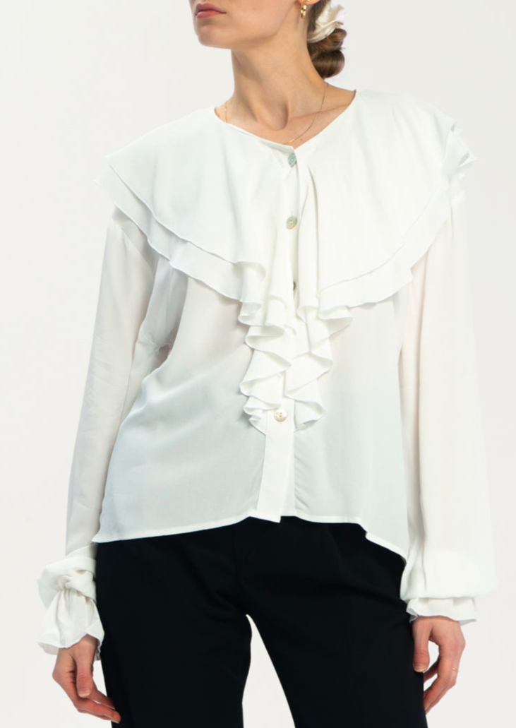 Delikatnie oversize'owa biała koszula z wiskozy z dużym marszczonym kołnierzem oraz rękawami. Wykonana została w 100% z wiskozy. Guziki z masy perłowej. Połącz ją z dżinsami lub innymi spodniami.