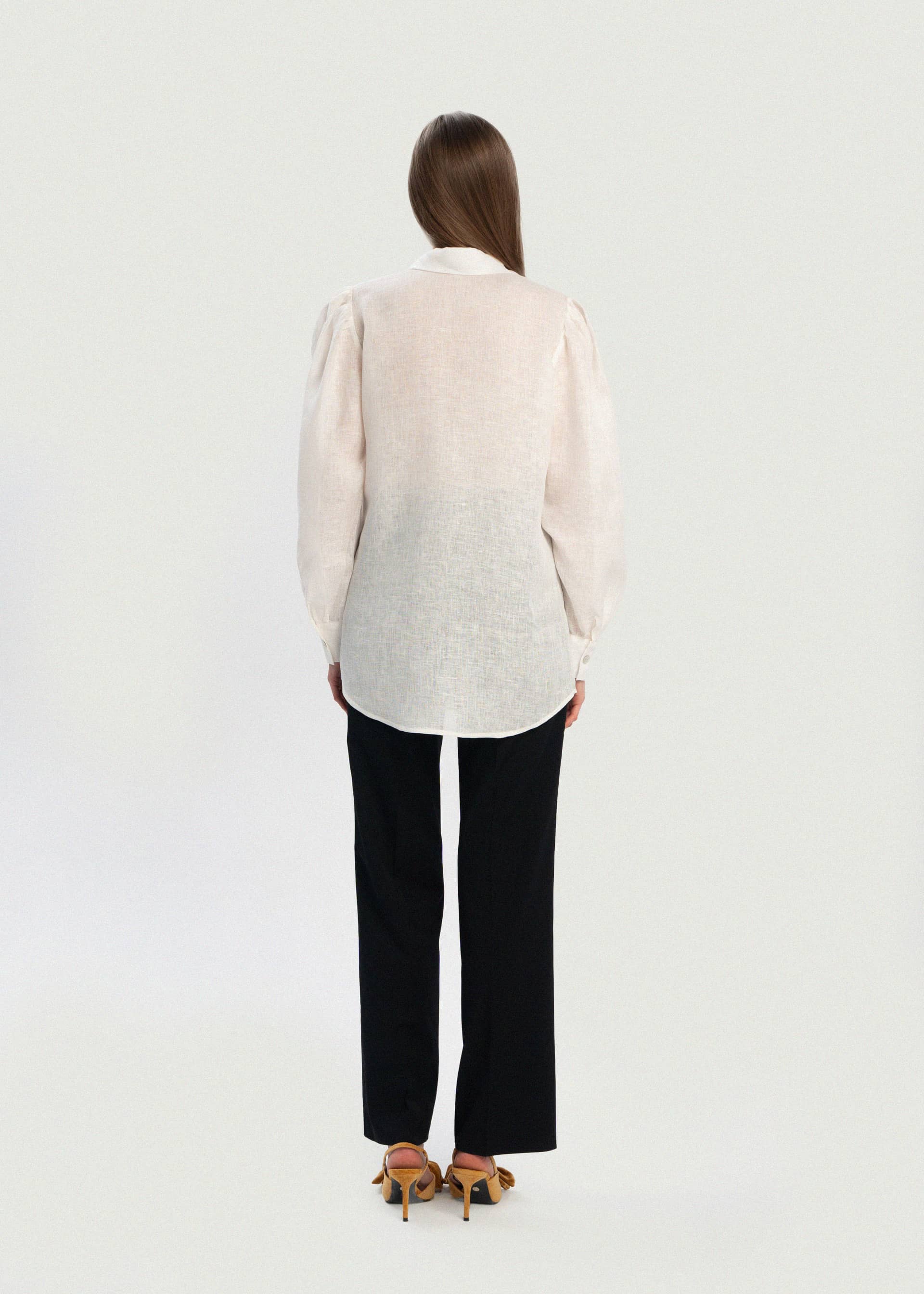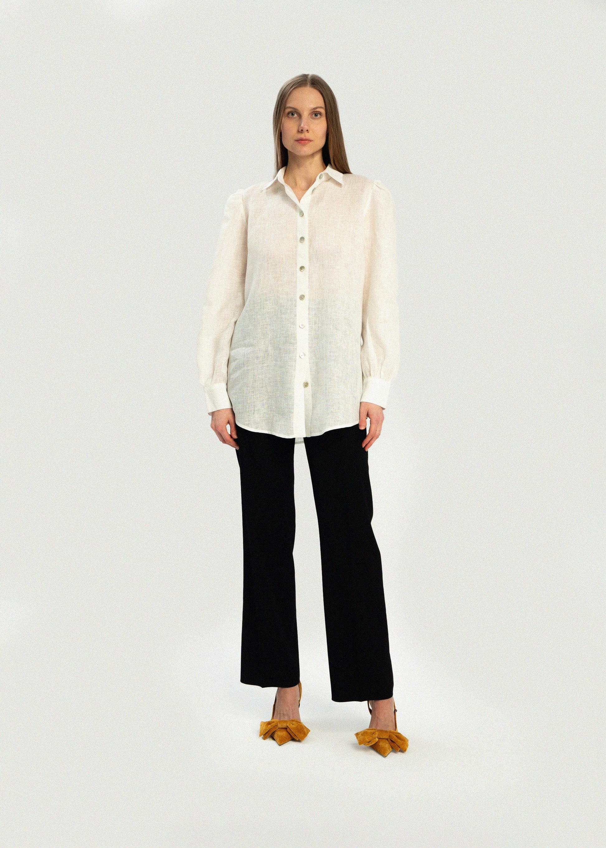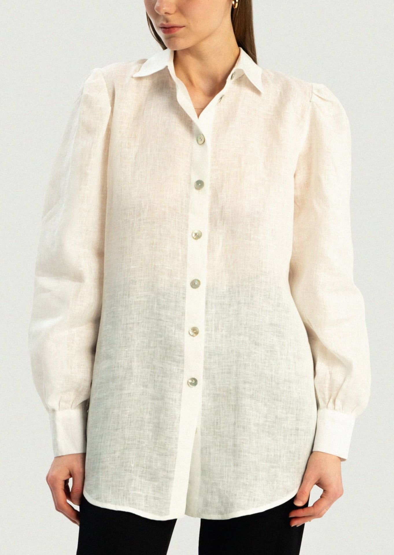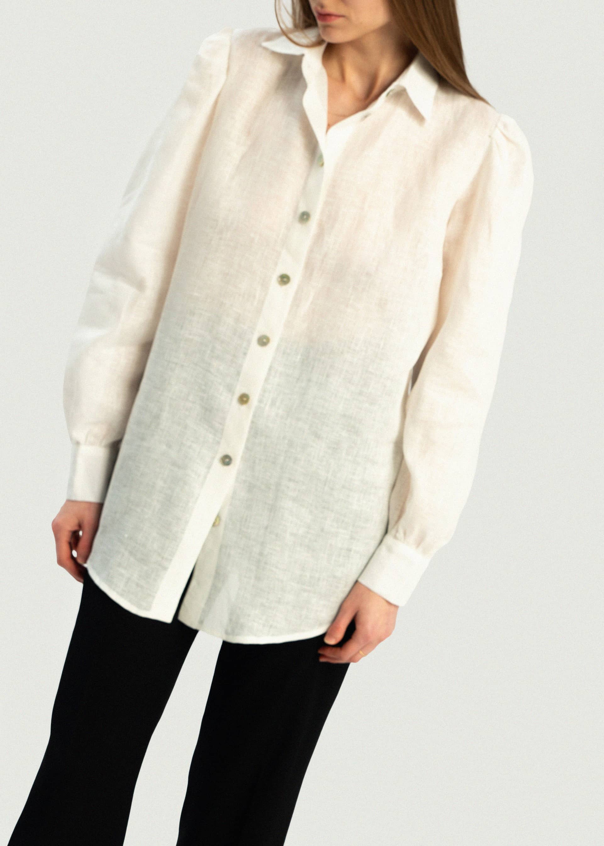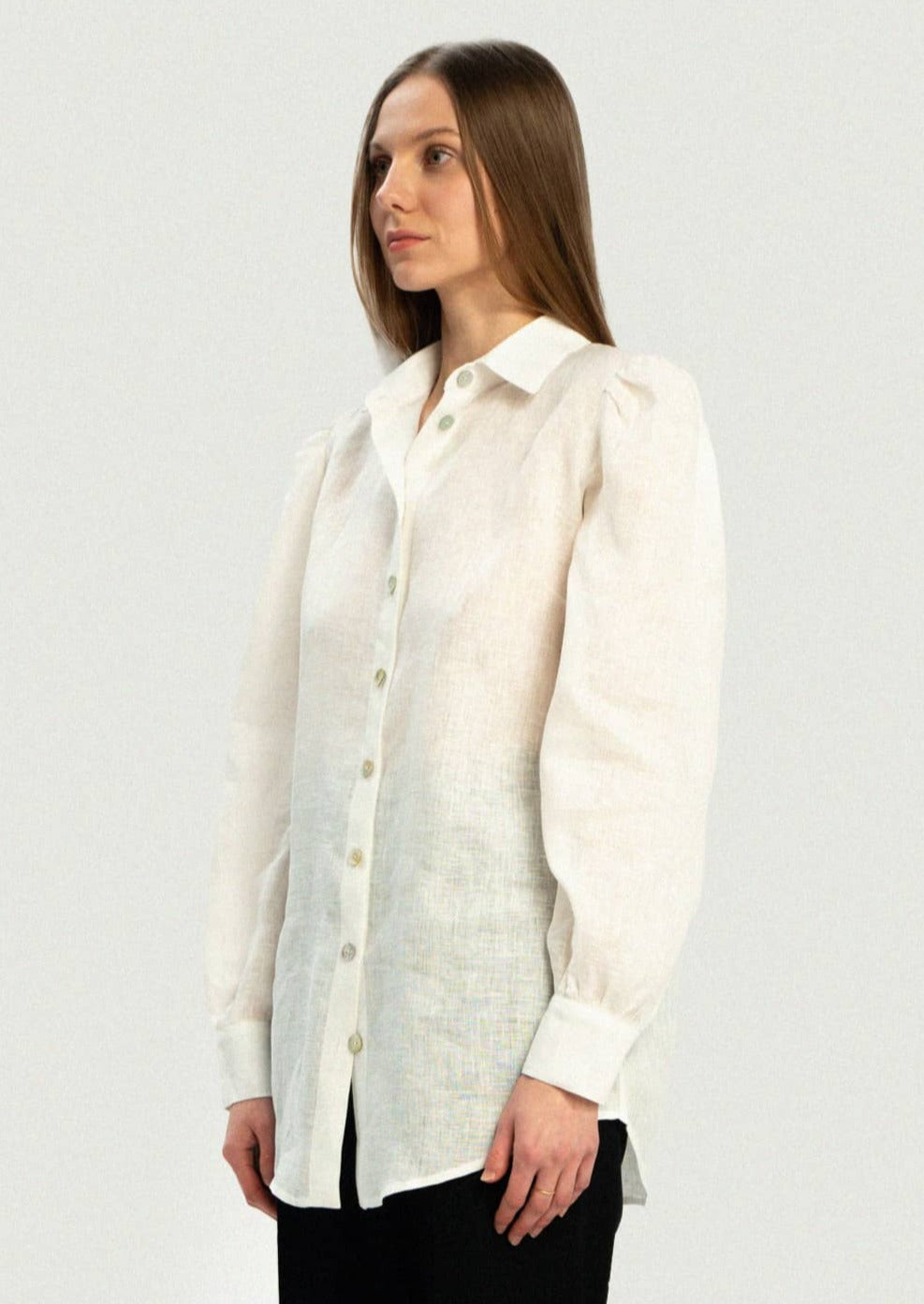 Oversize'owa biała koszula z cienkiego lnu z szerokim marszczonym rękawem. Wykonana została w 100% z włoskiego lnu. Guziki z masy perłowej. Połącz ją z dżinsami lub innymi spodniami.