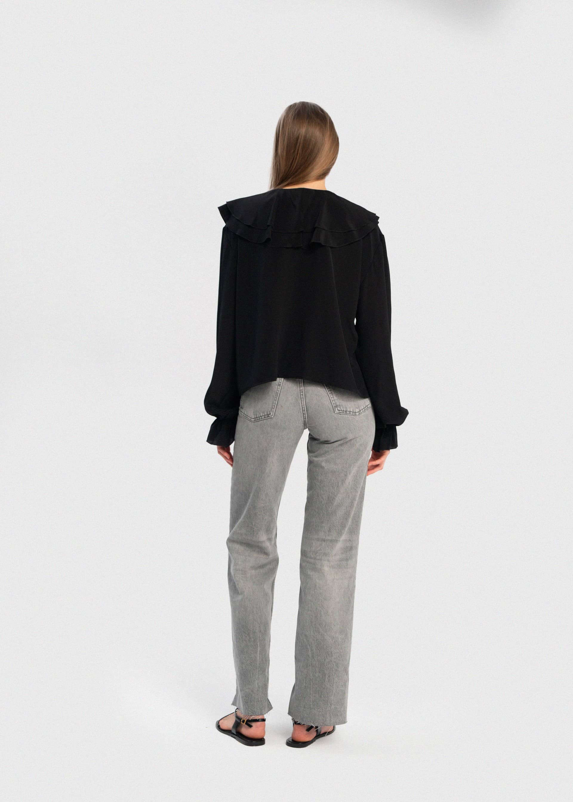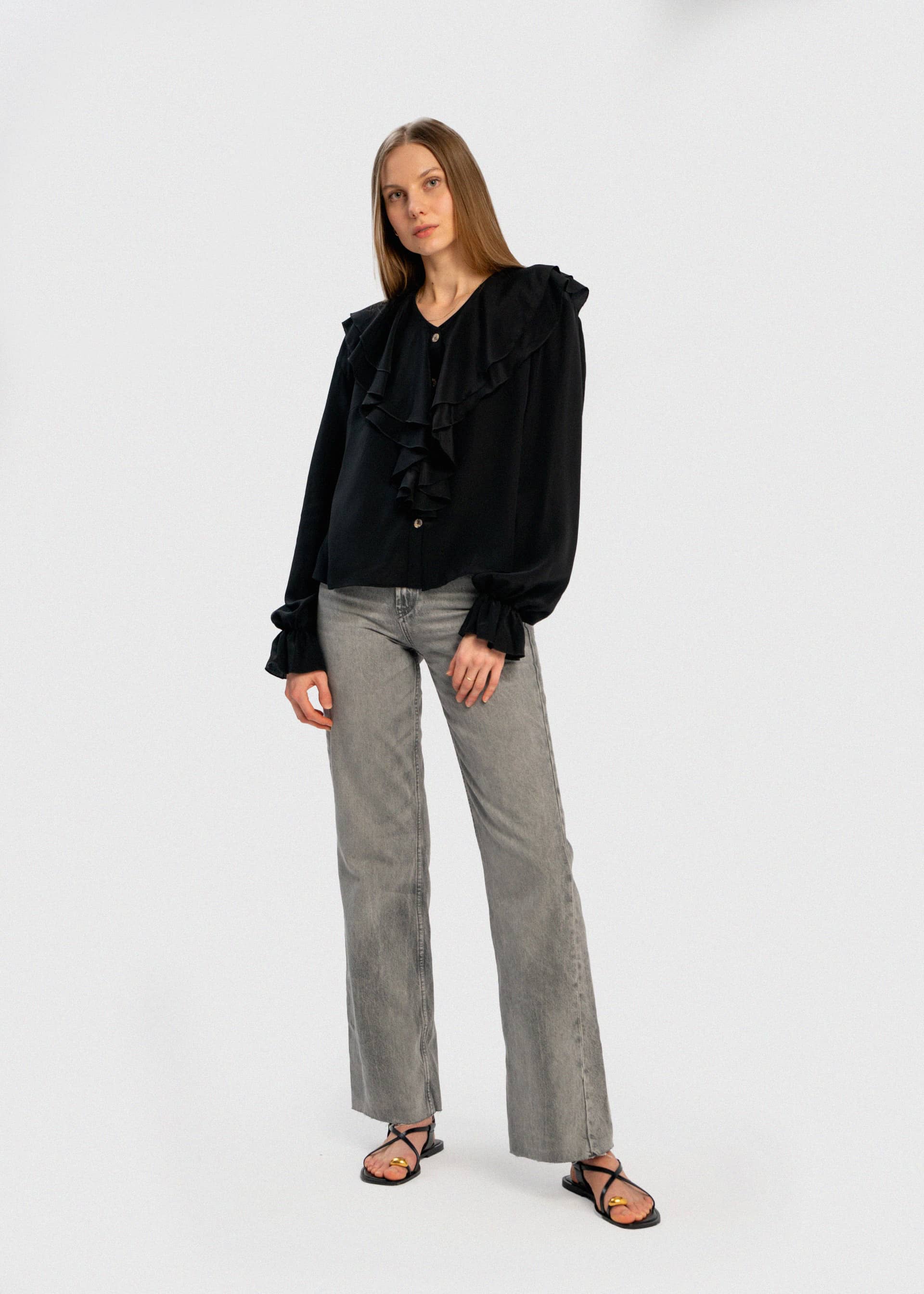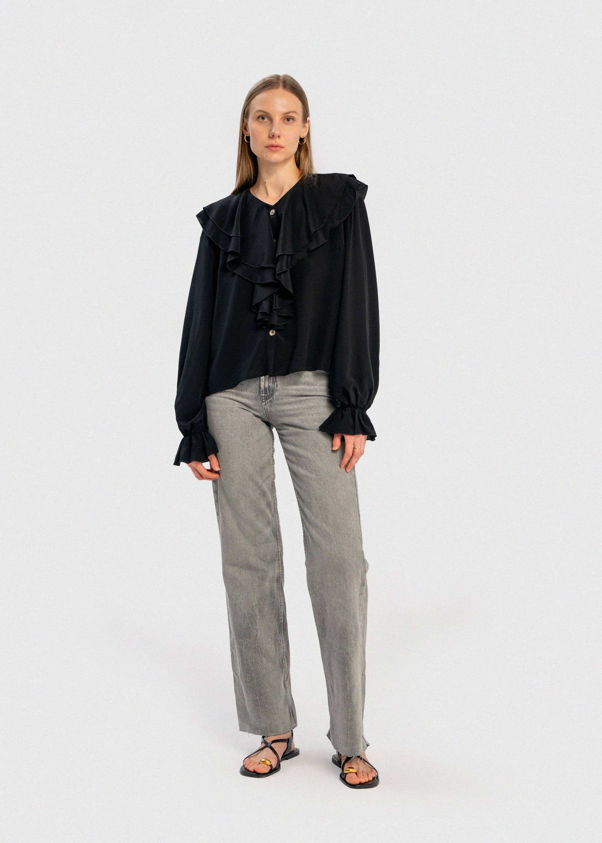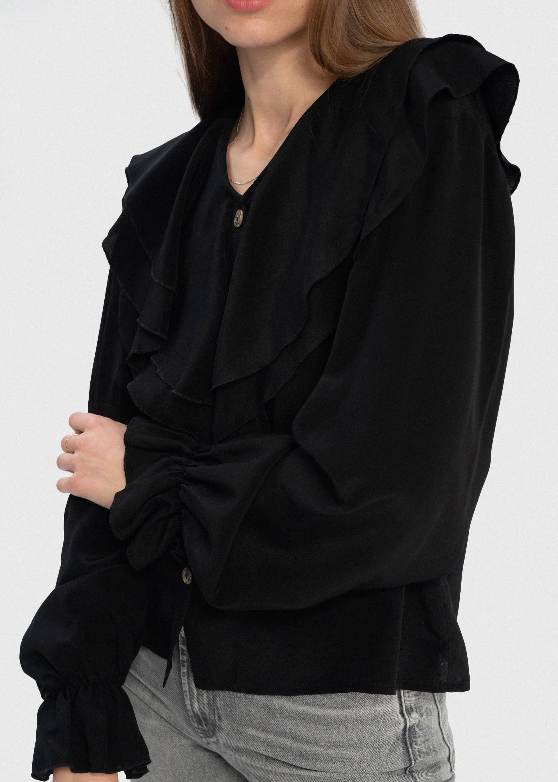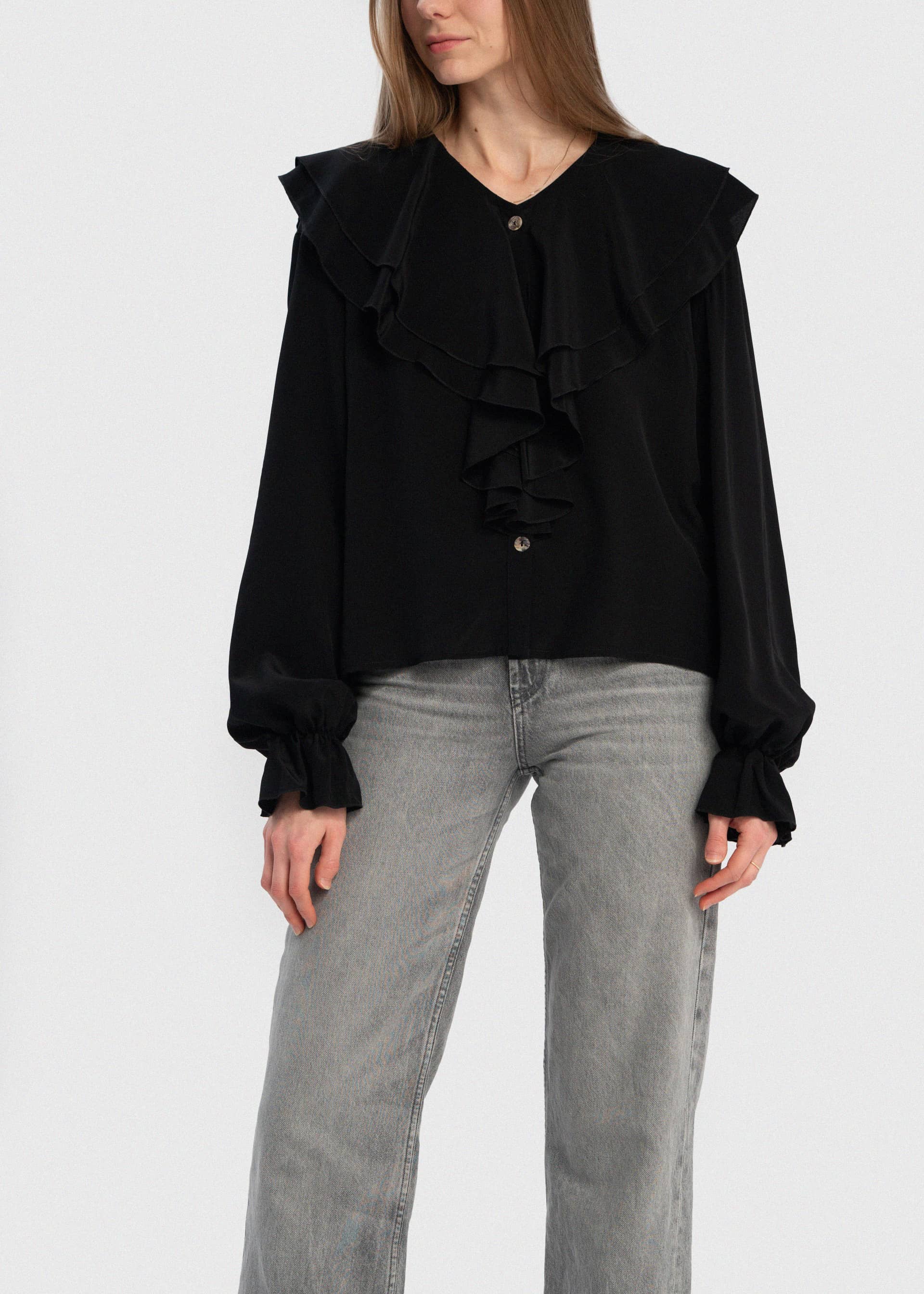 Delikatnie oversize'owa czarna koszula z jedwabiu z dużym marszczonym kołnierzem oraz rękawami. Wykonana została w 100% z jedwabnej krepy. Guziki z masy perłowej. Połącz ją z dżinsami lub innymi spodniami.