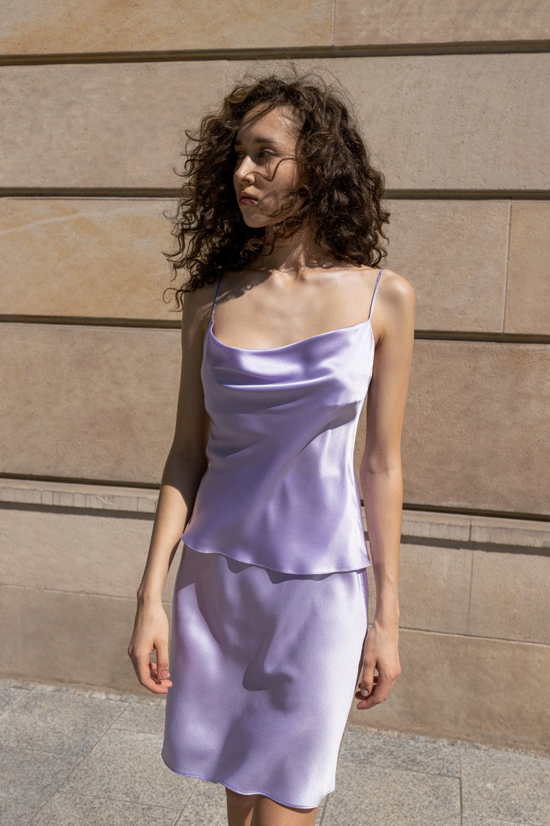 Jedwabny top Veri posiada drapowany dekolt. Został uszyty w 100% z naturalnego jedwabiu w kolorze liliowym. Dzięki regulowanym ramiączkom dostosujesz go do swoich wymiarów, a jedwabna tkanina sprawi, że będziesz czuła się w nim niezwykle komfortowo.